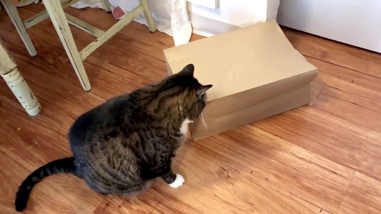 A cat sits and stares at a paper bag, and then he hits it and another cat pops out.