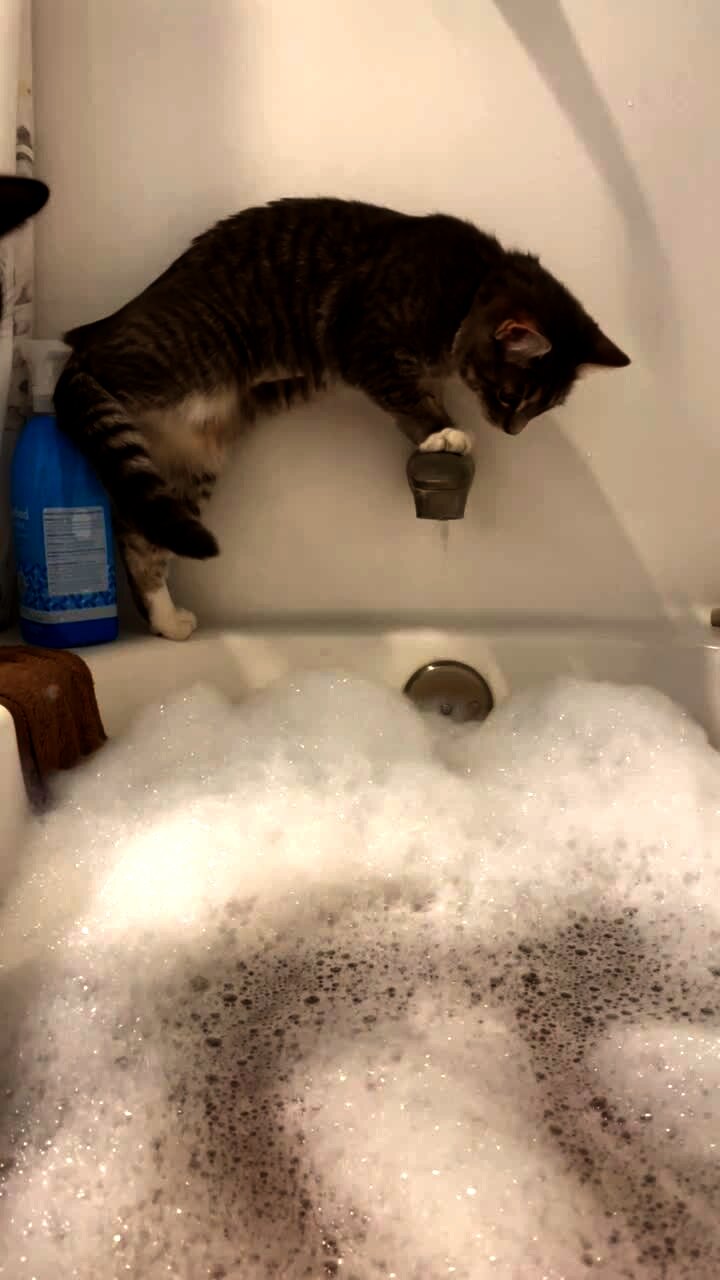 A cat sits on the side of a bathtub, falls in the water, panics, and runs out of the tub.