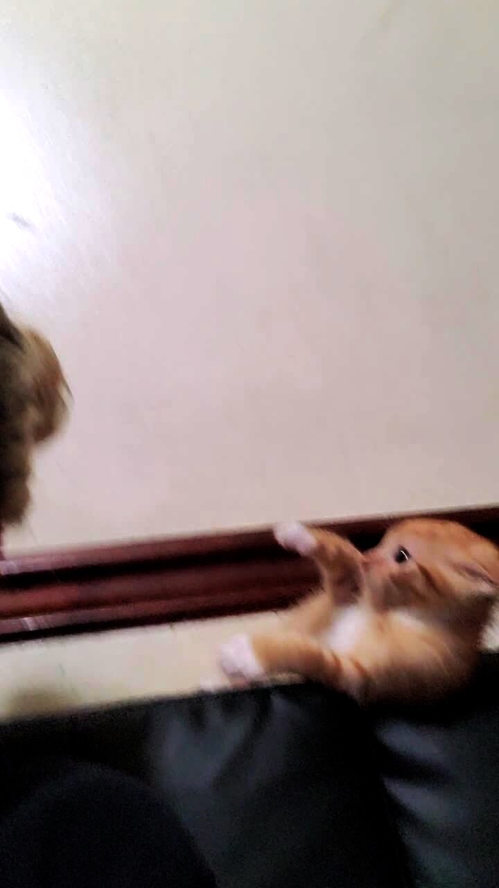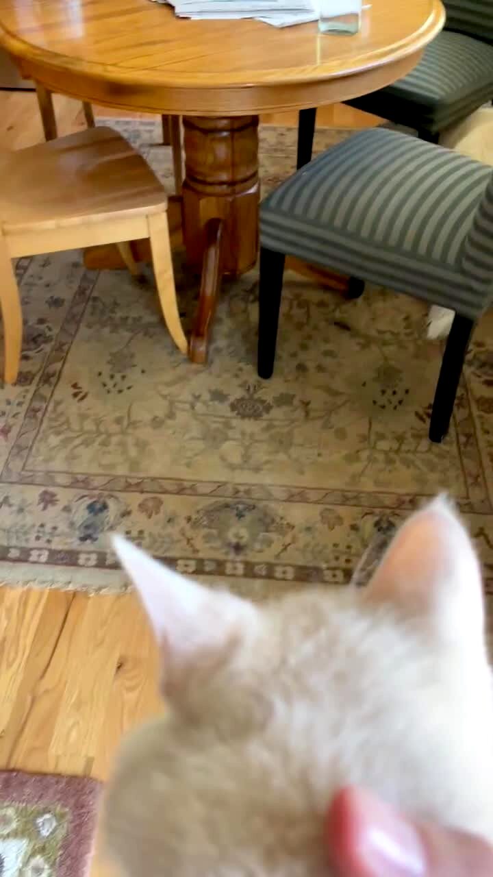 A kitten cat hisses and backs away from a woman's hair bun in the living room.