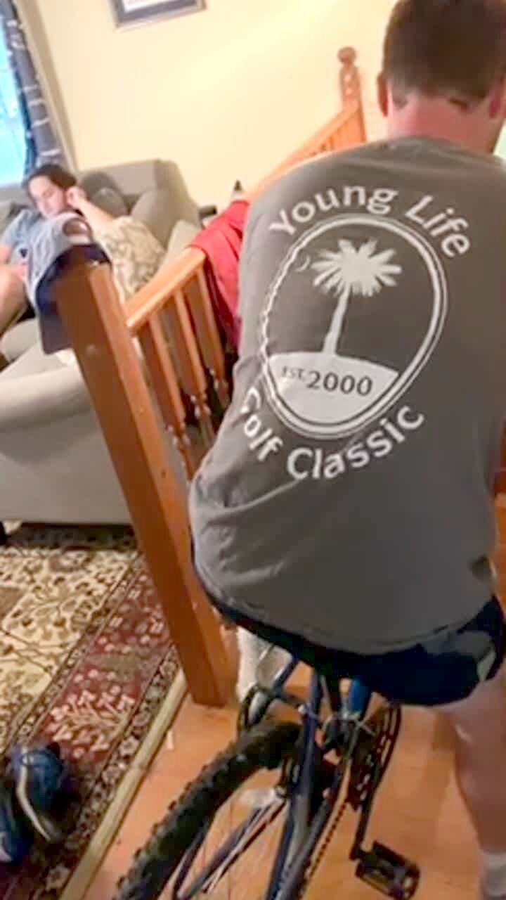 A man tries to ride a bicycle down a small set of stairs but falls down in a house.