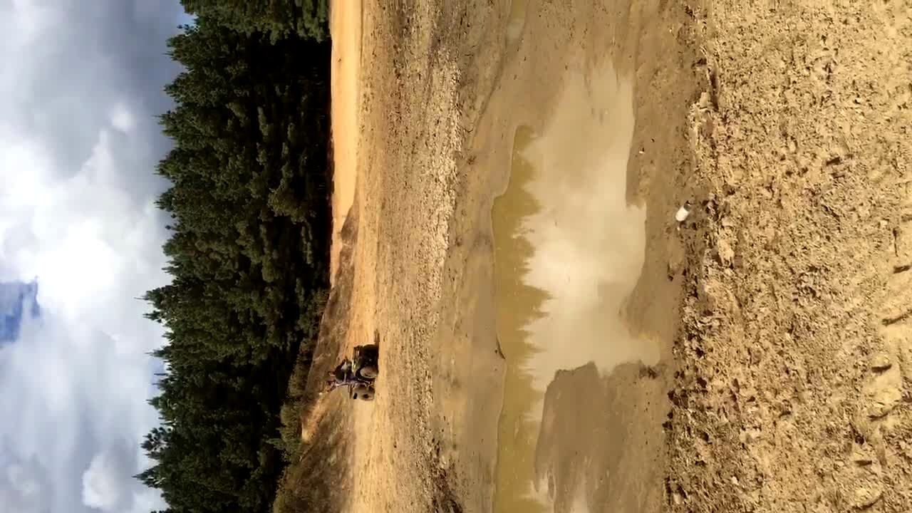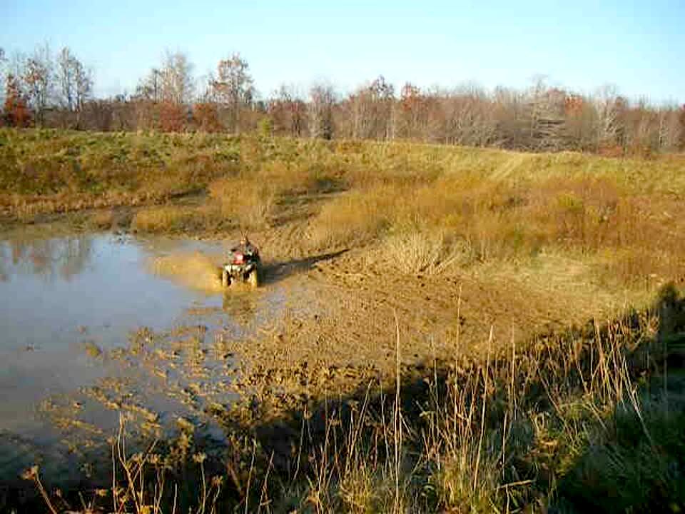 A man and woman drive an ATV into a mud puddle, and it sinks almost entirely under the water. Featured talent cleared only (the man and woman on the ATV who sink into the mud).