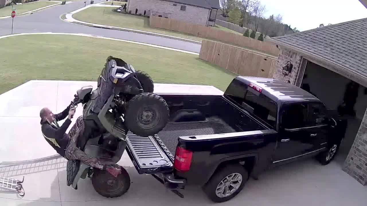 A man attempts to reverse his four-wheeler from a trailer onto the back of a truck when one of the ramps falls and he and the four-wheeler topple off to the driveway. Security footage.