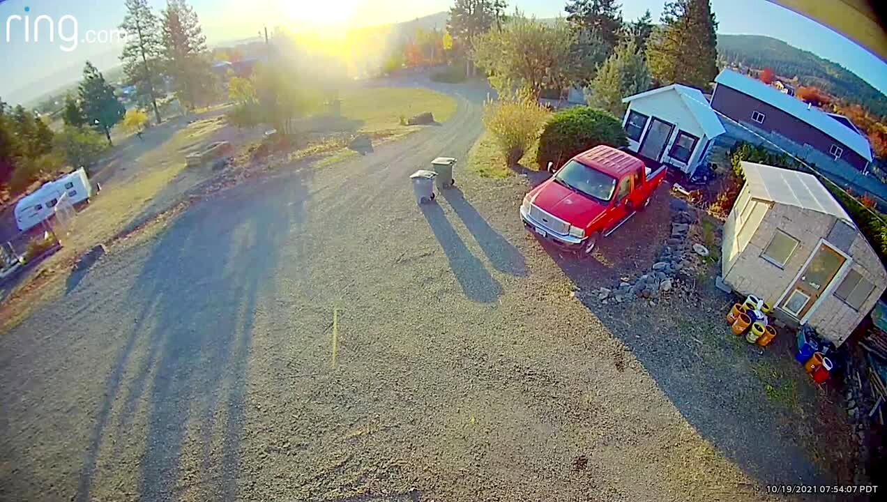 A pick up truck rolls backwards out of a driveway and off screen. Security footage.