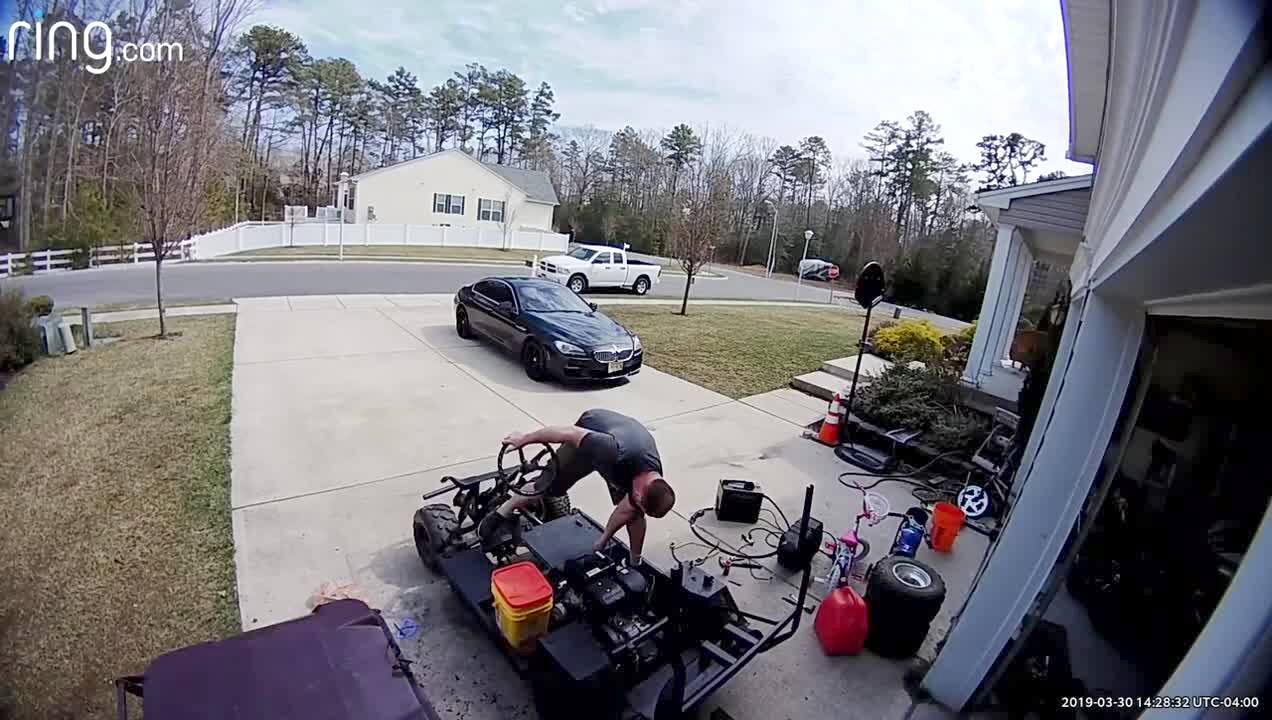 A man revs up the engine on an ATV and loses control of it, and then he chases it as it drives into a house across the street. Security footage.