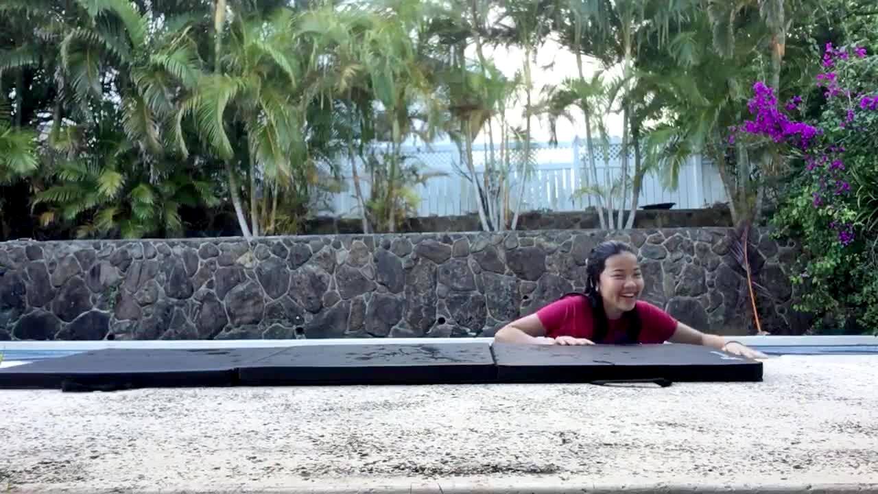 A teen girl jumps from a pool deck onto a trampoline and does a front flip. Then she runs back onto the deck to jump into the pool, but slips and falls in instead.