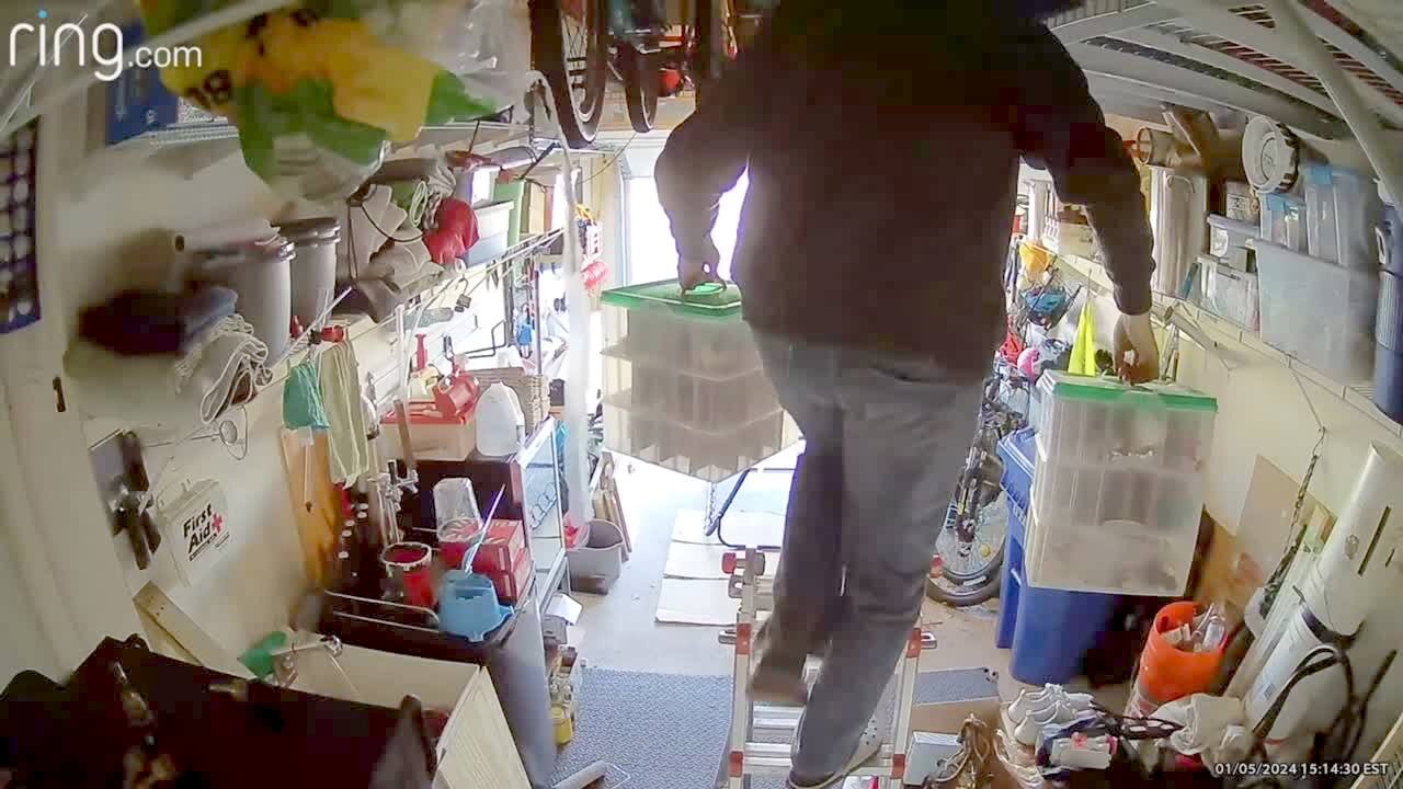 A man takes boxes of Christmas ornaments out of a crawlspace while he stands on a ladder, then he falls backwards into the garage.
