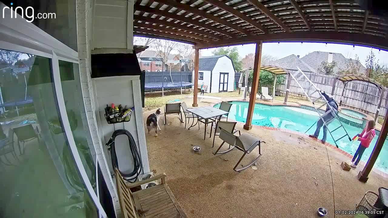 A dad climbs up a ladder to retrieve toys from the rooftop, but when he climbs back down he loses his balance and falls into a swimming pool.