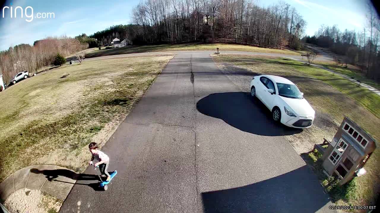 A young boy rides a scooter up a driveway and crashes into a garage door at full speed, then he falls down and cries. Security footage.