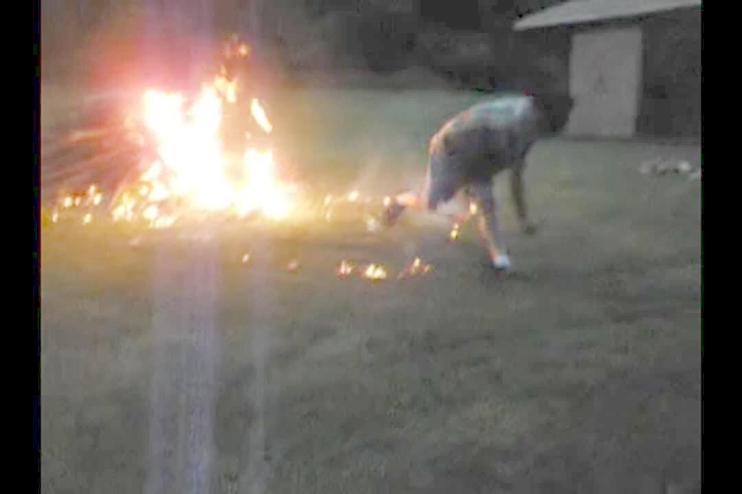A man pours gas from a container onto a firepit and the cannister catches on fire and he throws it into the front-yard and gas spills on the lawn and catches fire and he walks over and kicks it to the driveway and slowly walks off-camera. Security footage.