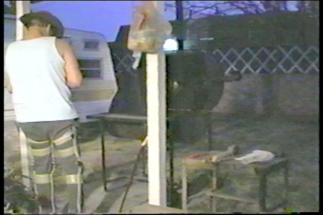 A man stands on a porch next to a barbecue grill, then a piece of aluminum foil is blown by wind off of a dish of food, and it covers his face. Security footage.