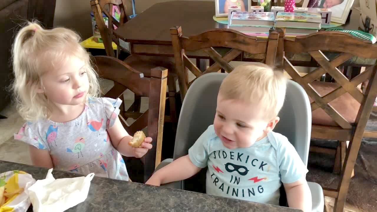 As a dad puts dishes in the dishwasher, his twin toddler daughters take them out, one by one. He thanks them for helping.