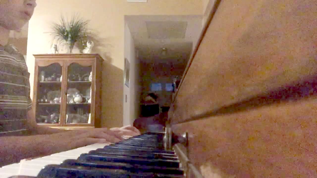 A young boy plays Beethoven on the piano. Two teen sisters walk in and dance in the background to annoy him.