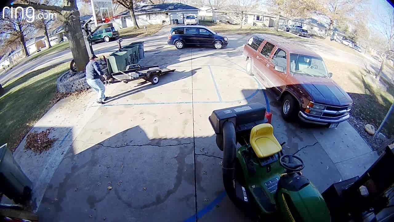 A man slips on bed frame metal poles and falls in a driveway. Security footage.