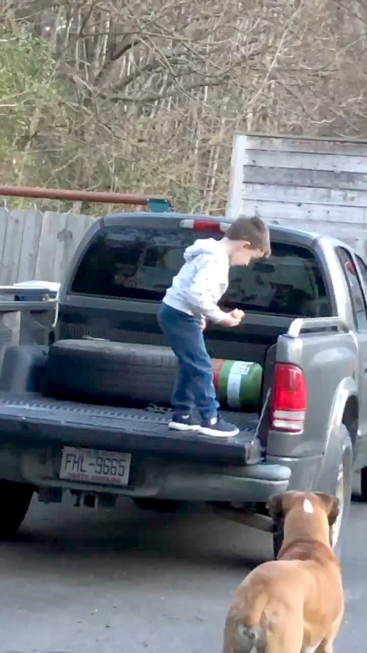 In the backyard, a woman drives an ATV hooked to a wagon with a young boy and girl. The woman drives all over the lawn until she takes a sharp turn and the wagon tips over and the children fall out.