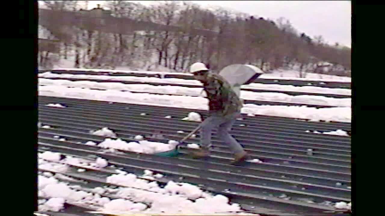 A man pokes at snow on a roof over a porch with a stick and the roof collapses.