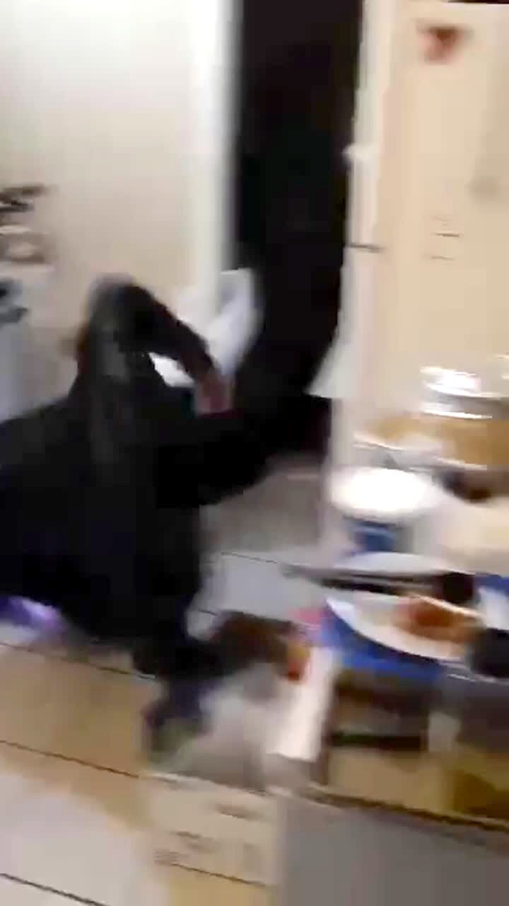 A man rides a hoverboard in a small kitchen, then he falls and crashes into a cabinet and the oven.