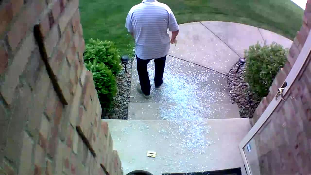 A man carries a glass shower door off his porch and it hits a step and shatters in his hands. Security camera.