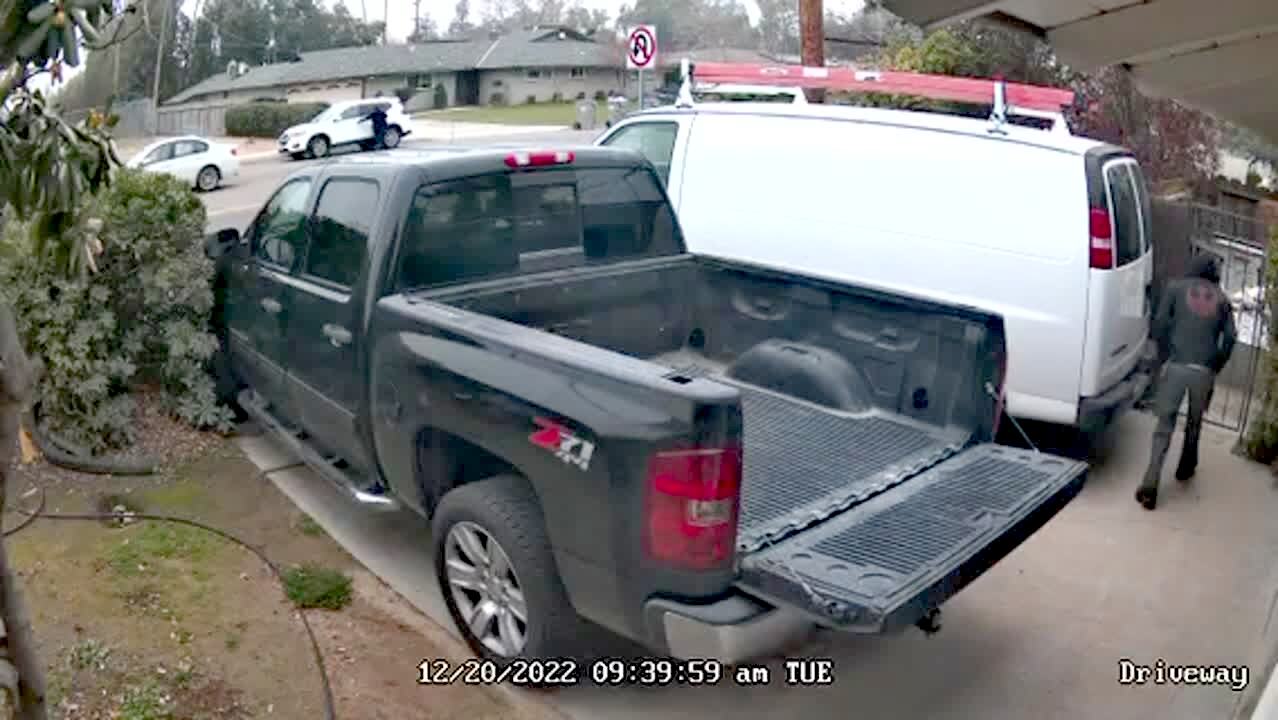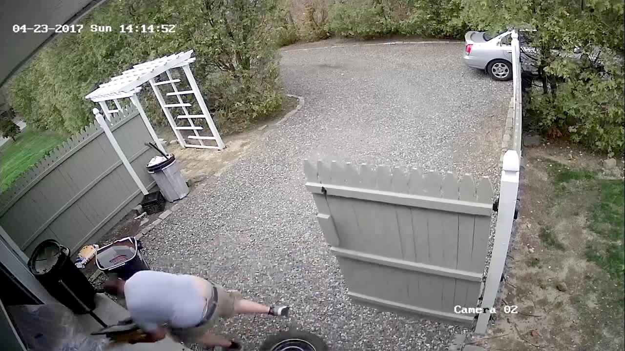 A man tries to slam a pickup truck's tailgate shut on a driveway, but it reopens and hits him in the groin. Security footage. Person across the street not talent released.