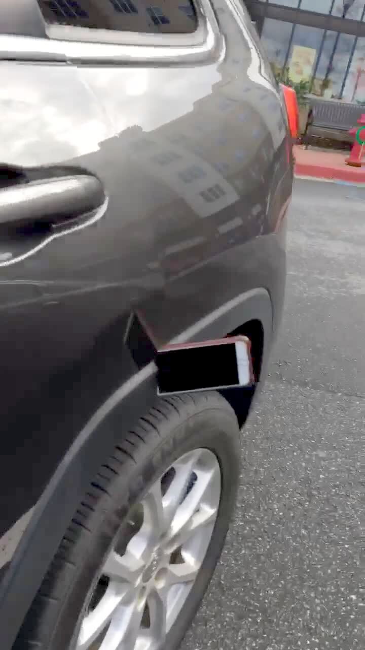 A woman has accidentally closed a car door on her iPhone and clamps it in, and the screen is cracked at the bottom. She laughs in disbelief.