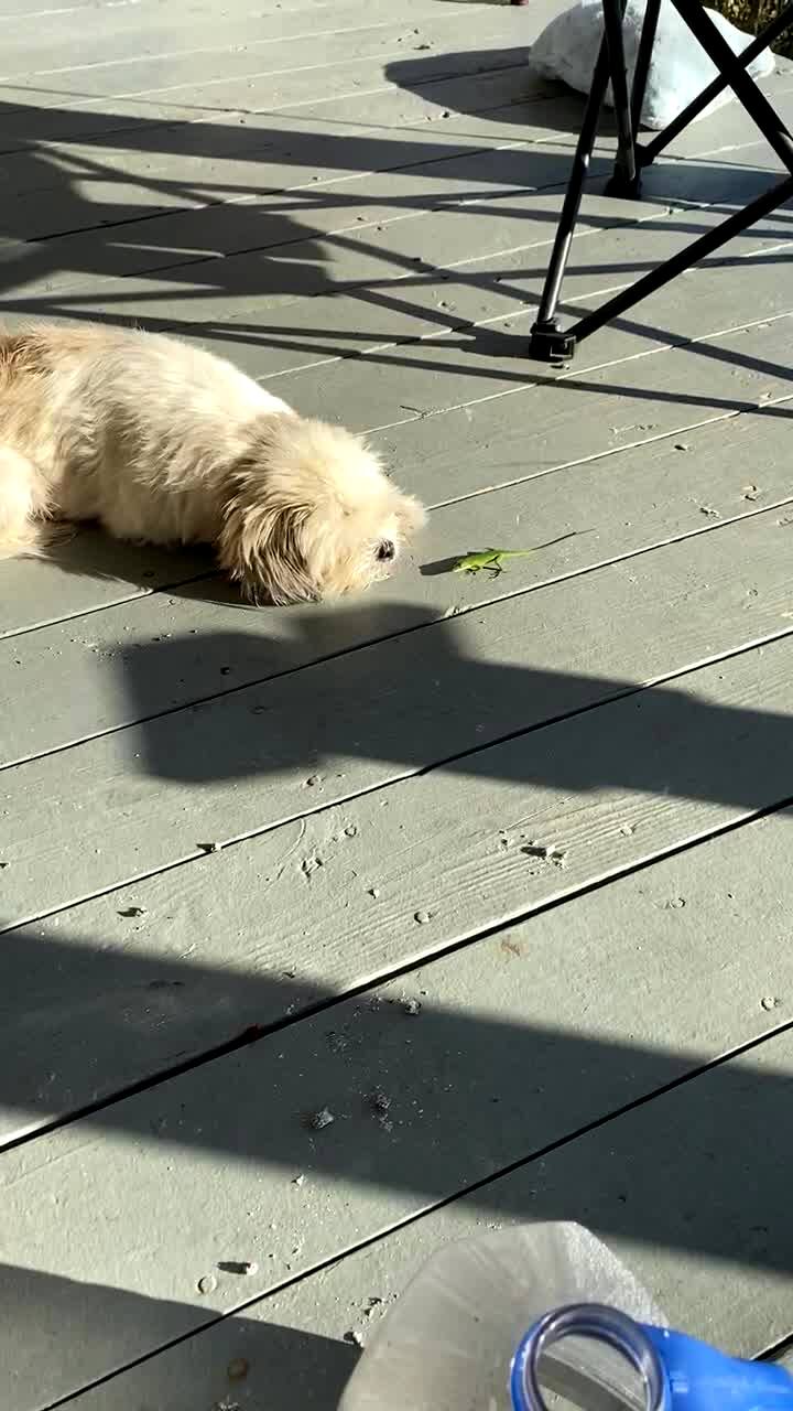 A Shih Tzu dog sleeps on the porch, and a lizard approaches the dog then bites at its tongue and the dog jumps.