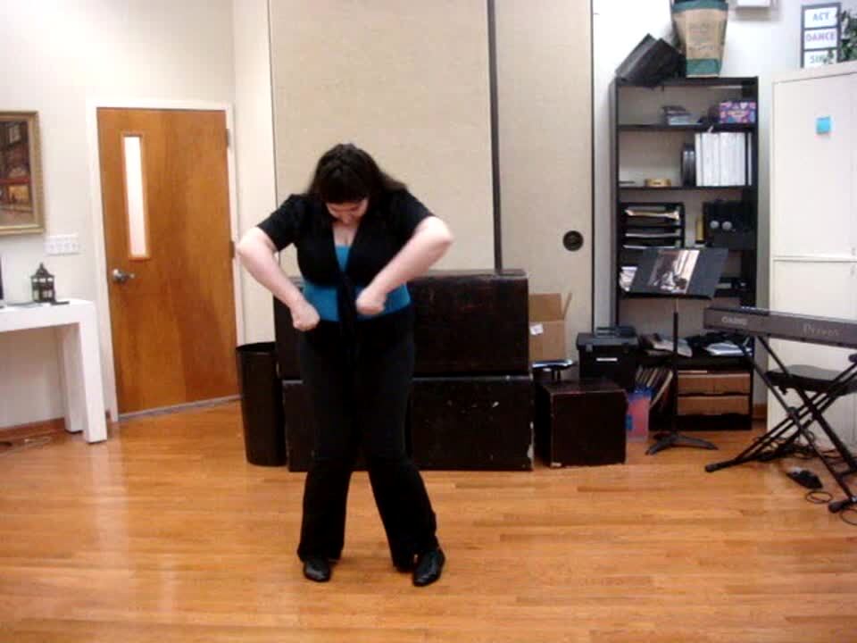 A woman dances to a Broadway musical song indoors and falls down on her butt. Short tail