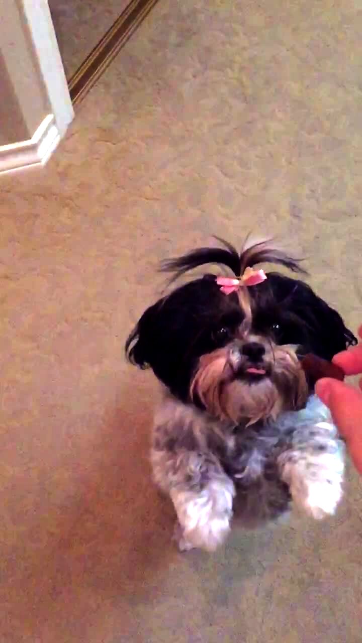 A small Shih Tzu dog struggles to eat/ lick a small piece of pepperoni off of its face indoors.