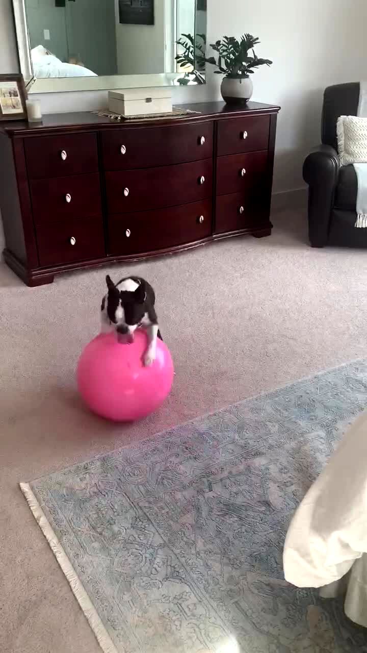 A Boston Terrier dog in a bedroom plays with a ball as it stands on its back legs and pulls the ball towards itself as it walks backwards. The woman with the camera says it's looks like a circus trick.
