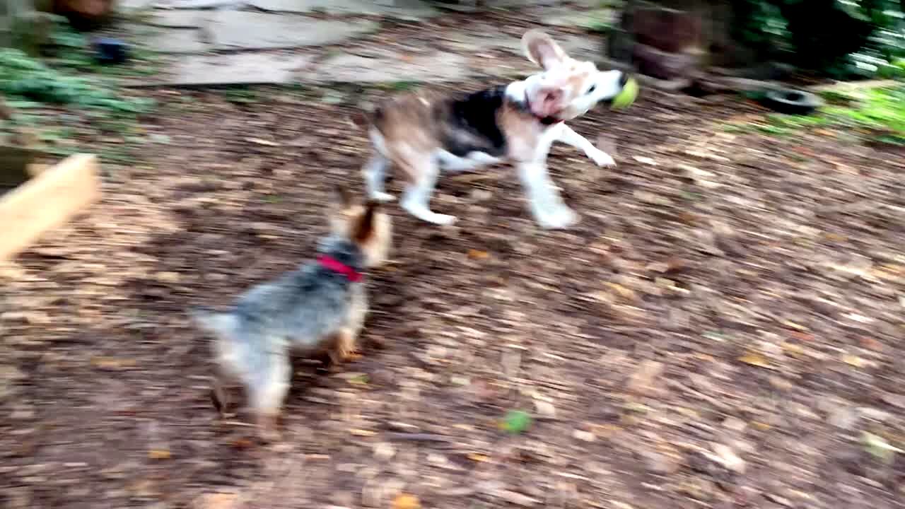Two dogs play with a ball outdoors. The yorkie dog takes the ball while the beagle dog isn't looking. The beagle searches for the ball.