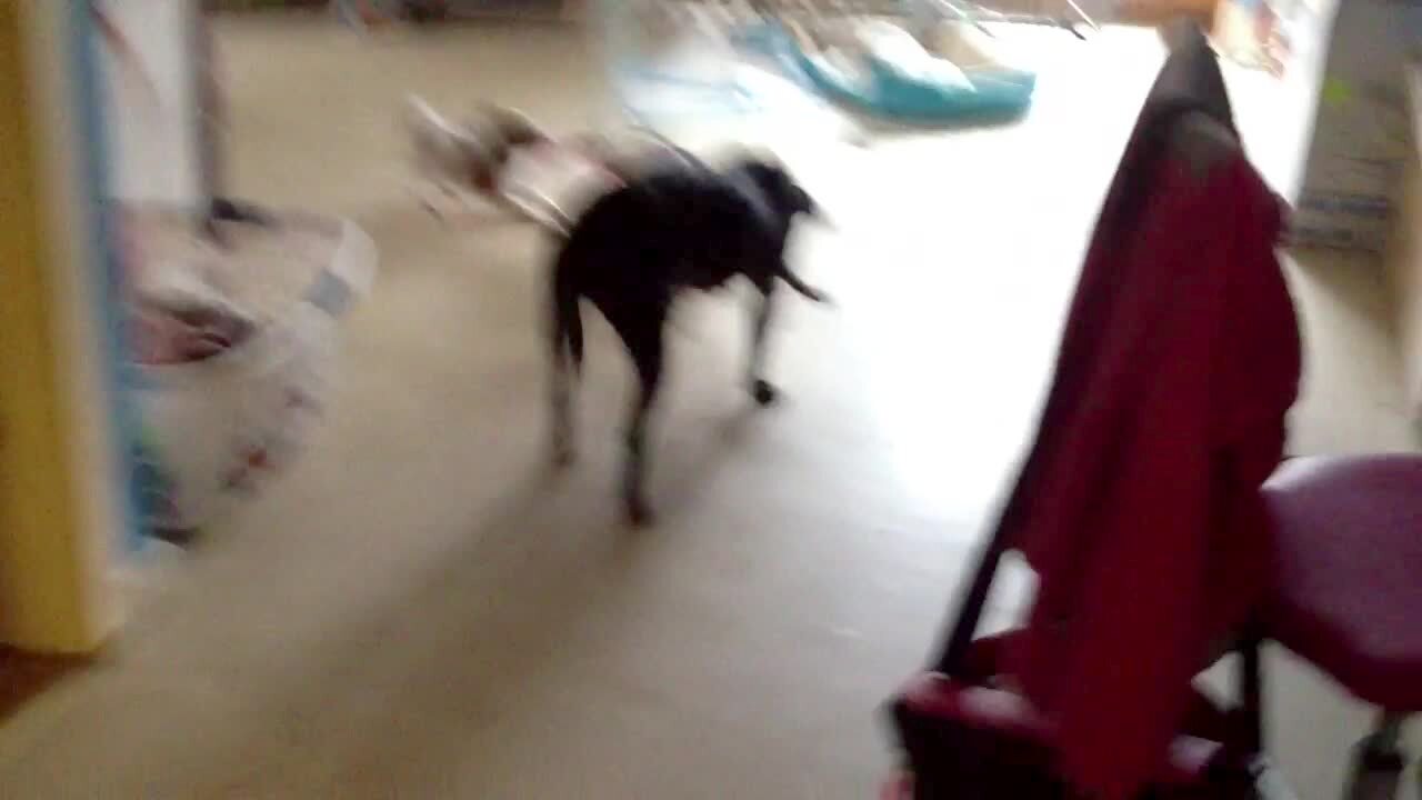 Dog reaches for a ball on outside table. Spins in circles trying to get it.
