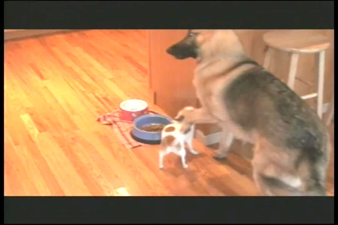 Chihuahua dog snaps at a German Shepherd dog when it's eating. Big dog is afraid of smaller dog.