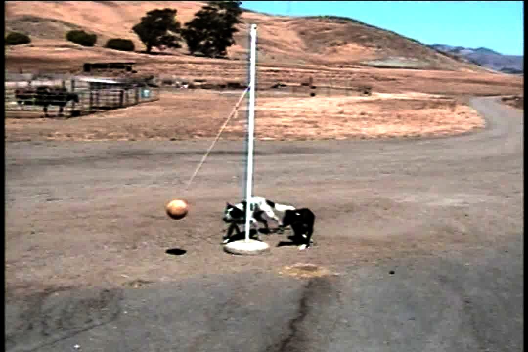 A dog jumps to catch a toy, but it hits its mouth and bounces to another dog's mouth in slow motion.
