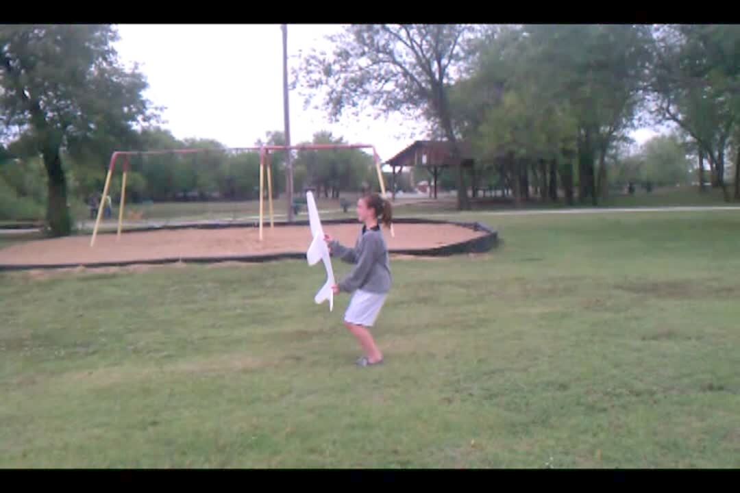 pranks: Woman rigs styrofoam airplane so that it will come back and hit him when he throws it in yard.