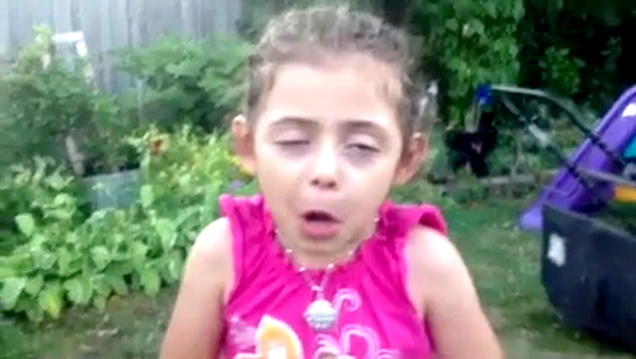 "Little Animal Imitator" A little girl makes silly faces as she plays with a toy that makes animal noises, amusing the man behind the camera outdoors.