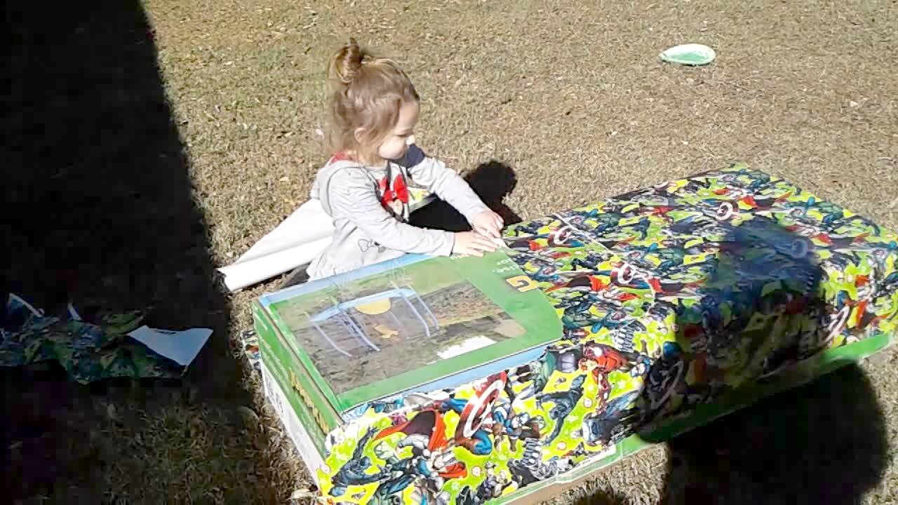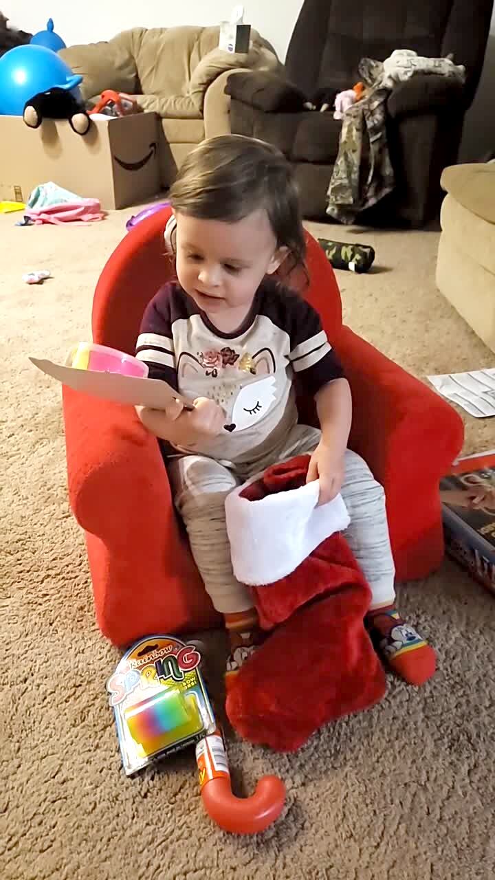 A teen girl tries to dance down a flight of stairs to the song Rockin Around the Christmas Tree and she slips and falls down the steps.