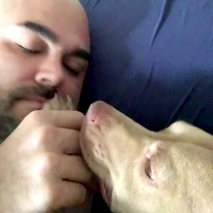 A dog puts its paws on a man's mouth whenever he tells it that it's time to wake up in the bedroom.