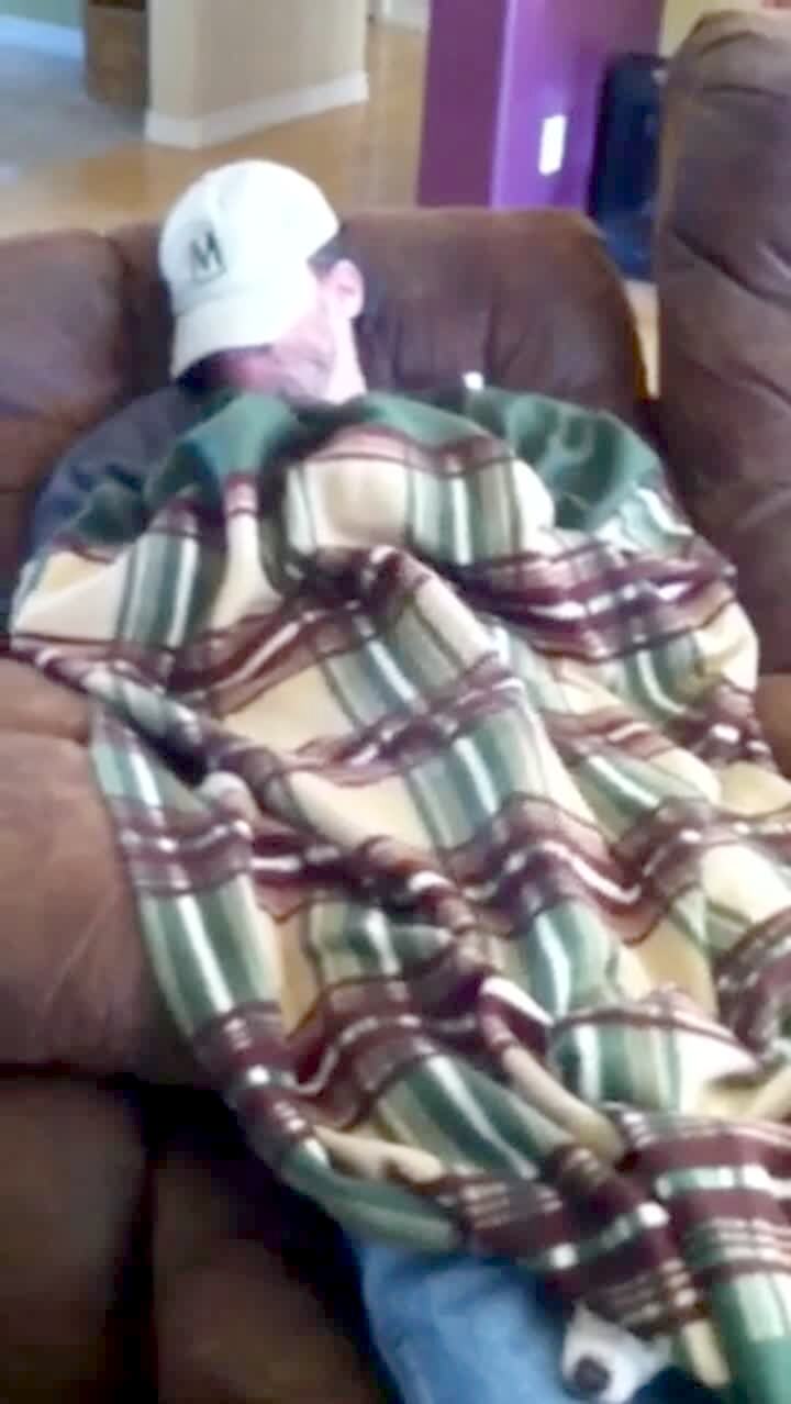 A man sleeps in a chair with a blanket over him and a chihuahua dog on his lap indoors. The dog wags its tail under the blanket and it looks like the man's penis. The dog pokes its head out.