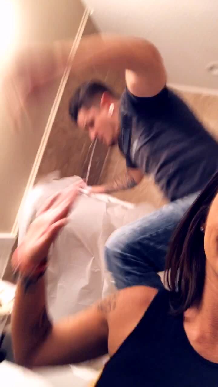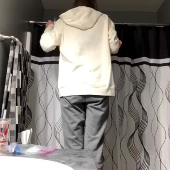 A woman dances in the bathroom while a man works behind her and leans on the curtain rod which breaks and he falls down into the tub.