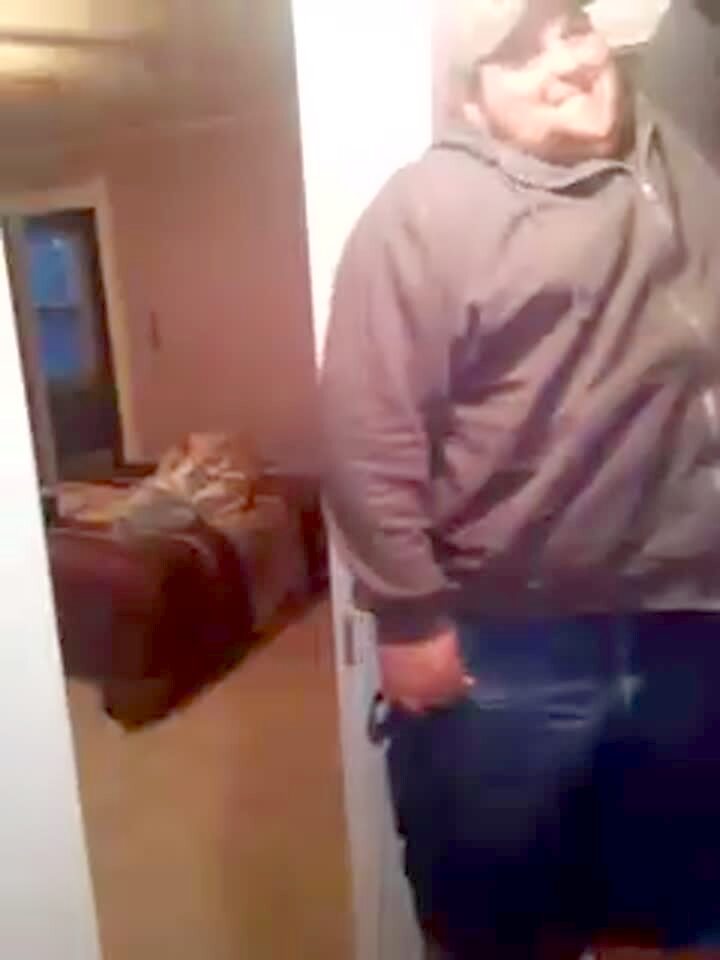 A man carries a door through the backyard and steps into the pool and falls in the water and the door hits him on the head. Security footage.