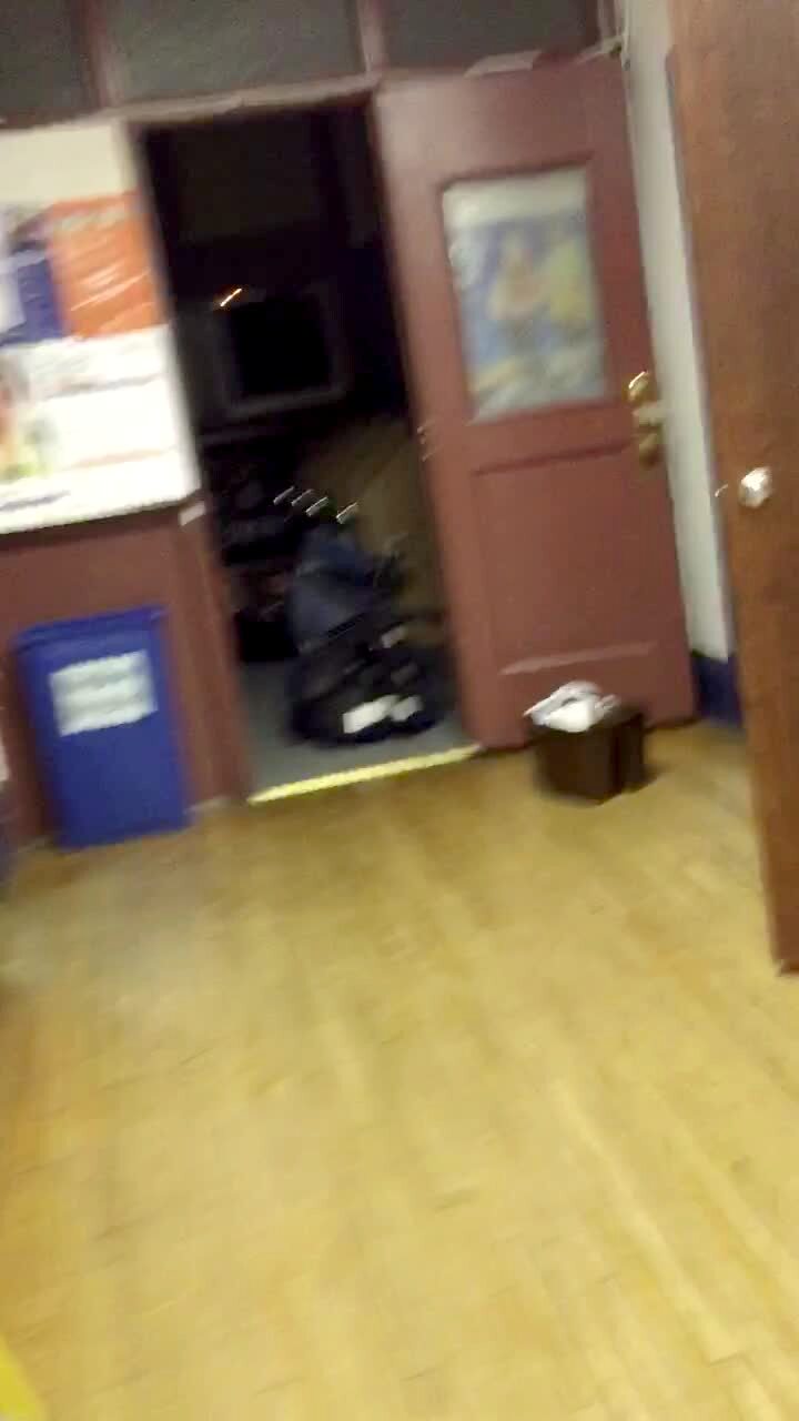 A young man rides a rolling chair down a hallway indoors when it hits a threshold and falls over.