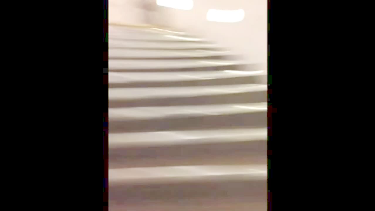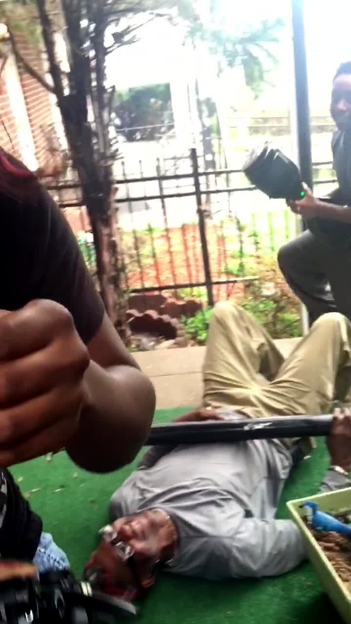 Two boys accidentally drop a trash can bucket full of water onto a teen boy outdoors while trying to pour it on to his head in an Ice Bucket Challenge from a balcony outdoors.
