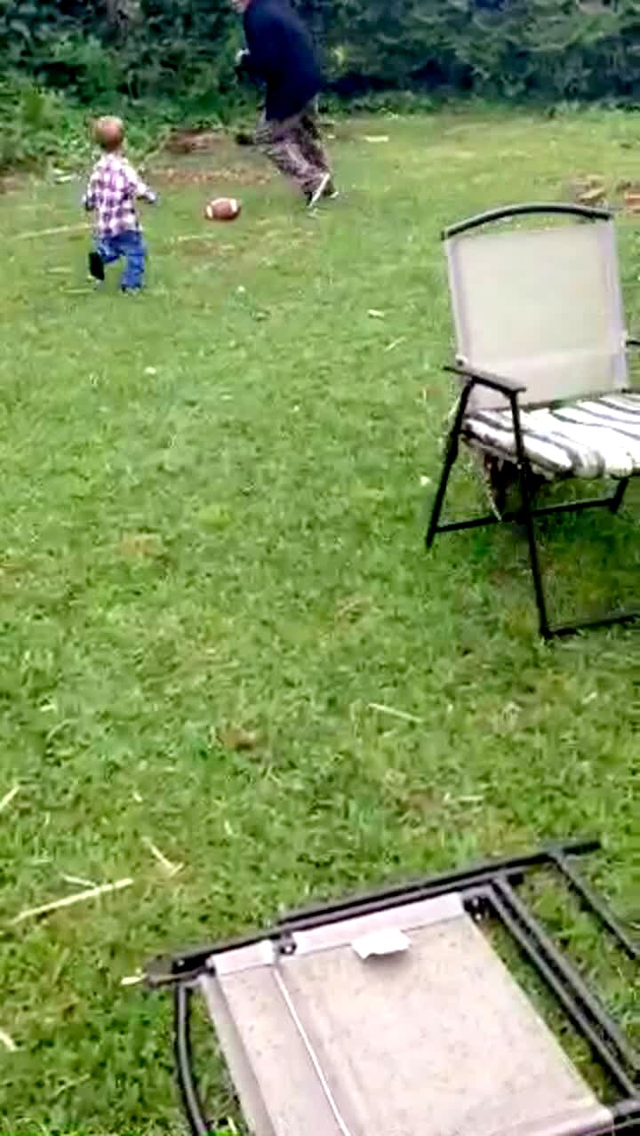 A hog pig chases a tot boy and man around outdoors and knocks the boy over.