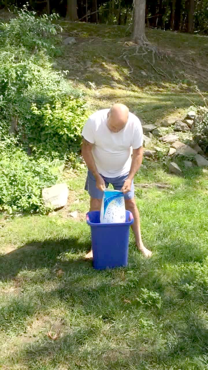 A man dumps a bag of ice into a bucket of water, then pours it over his head outdoors. The ice comes out as one large piece and hits him on the top of the head. ALS Ice Bucket Challenge