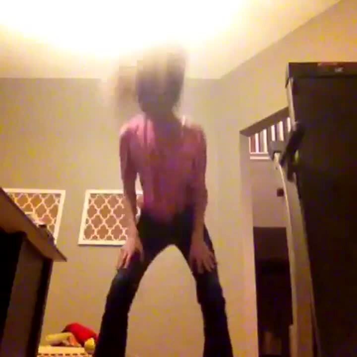 A teen girl dances with a scarf around her head. In the background a man stands on a step stool and gets hit by a moving ceiling fan. Music rights not cleared.