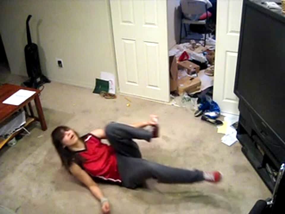 A teen girl dances in the kitchen. She does a kick and falls to the floor, hurting herself. Music rights not cleared.