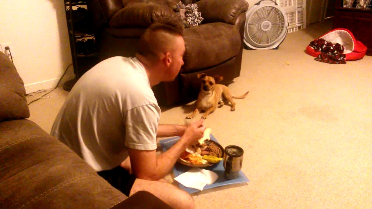 A dog with borrowed hands sits at the kitchen table and makes a sandwich. The man whose arms are being used narrates how to make the sandwich, but the dog eats the food while the man puts the sandwich together, so he cannot finish it.
