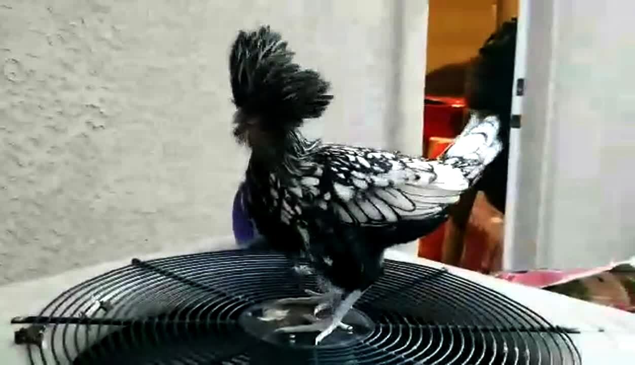 A polish chicken bird stands on an air conditioner fan. His feathers blow upward like a bird version of Marilyn Monroe