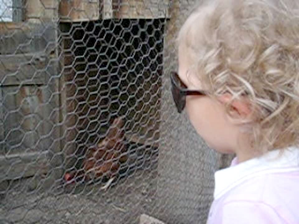 Tot girl looks at a rooster in a cage, calls it a chicken nugget. When it crows, she calls it a lion.
