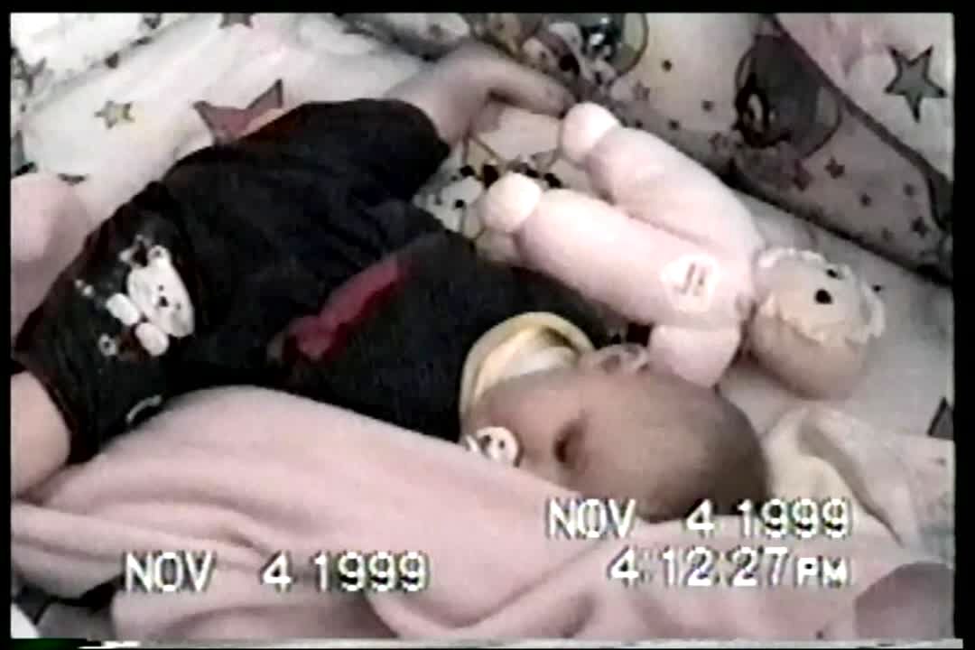 7 month old baby girl has fallen asleep doing the splits laying down in her crib.