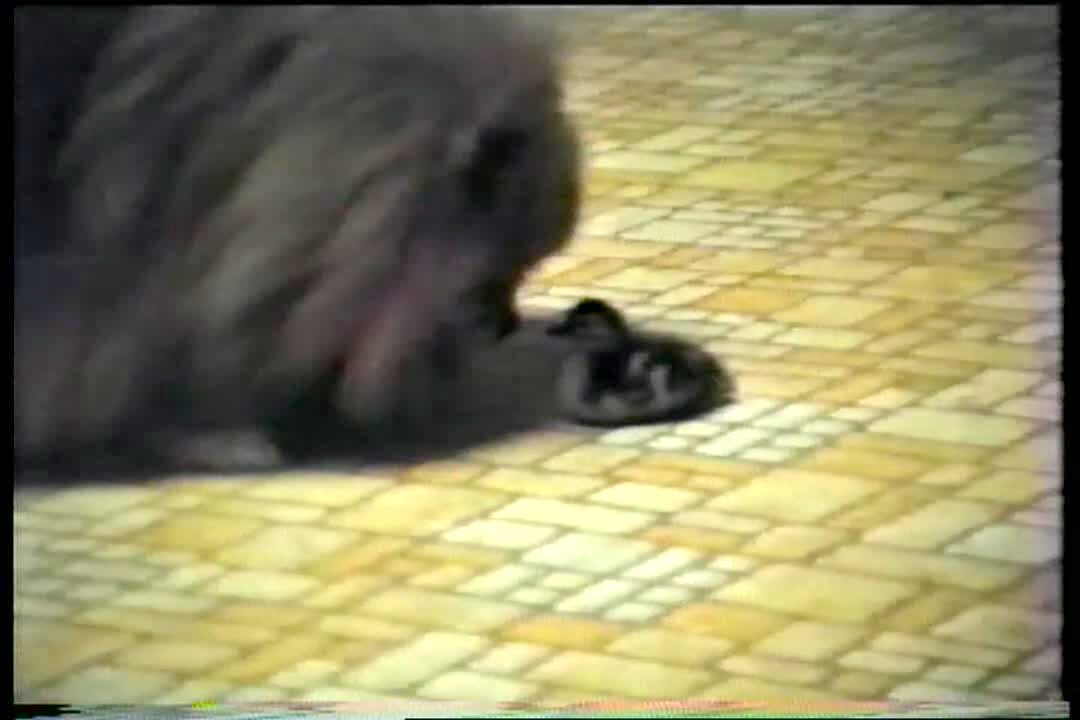 A tot girl pets a baby chick then she grabs its head and tries to put it in her mouth.
