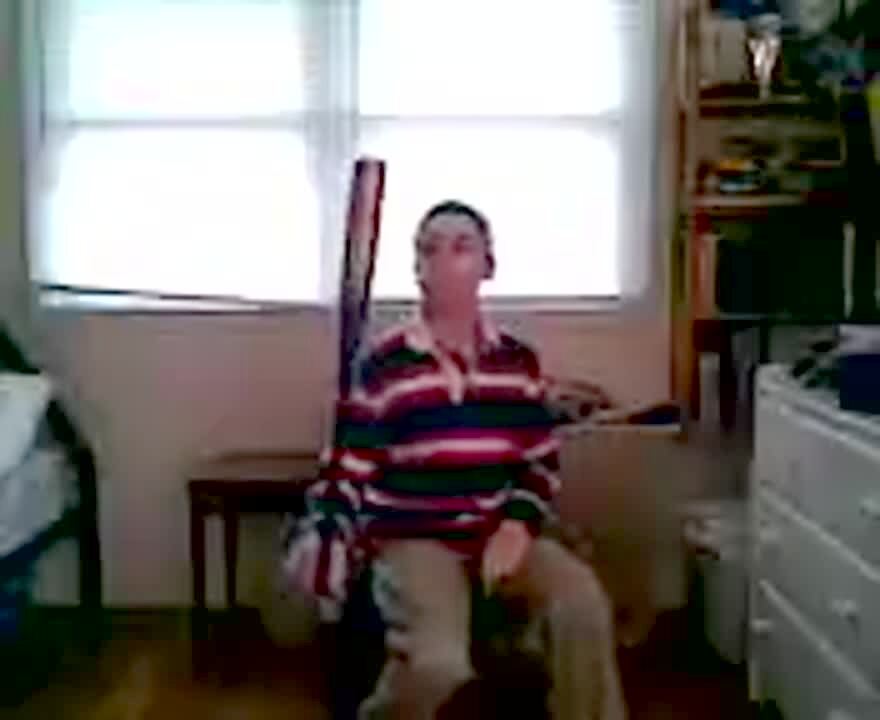 Teen boy sits watching TV & simultaneously balances a baseball bat on his finger, but the bat falls & hits him in the head.